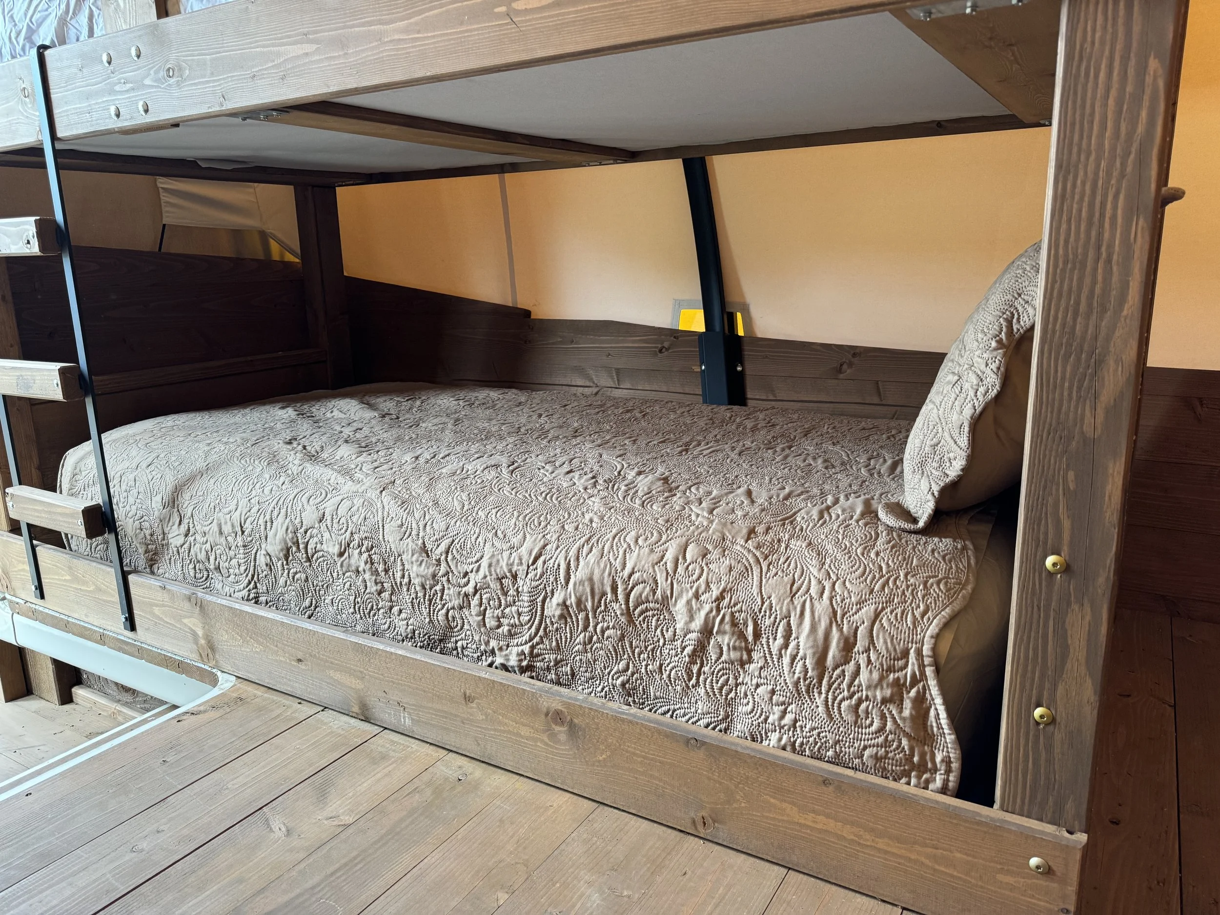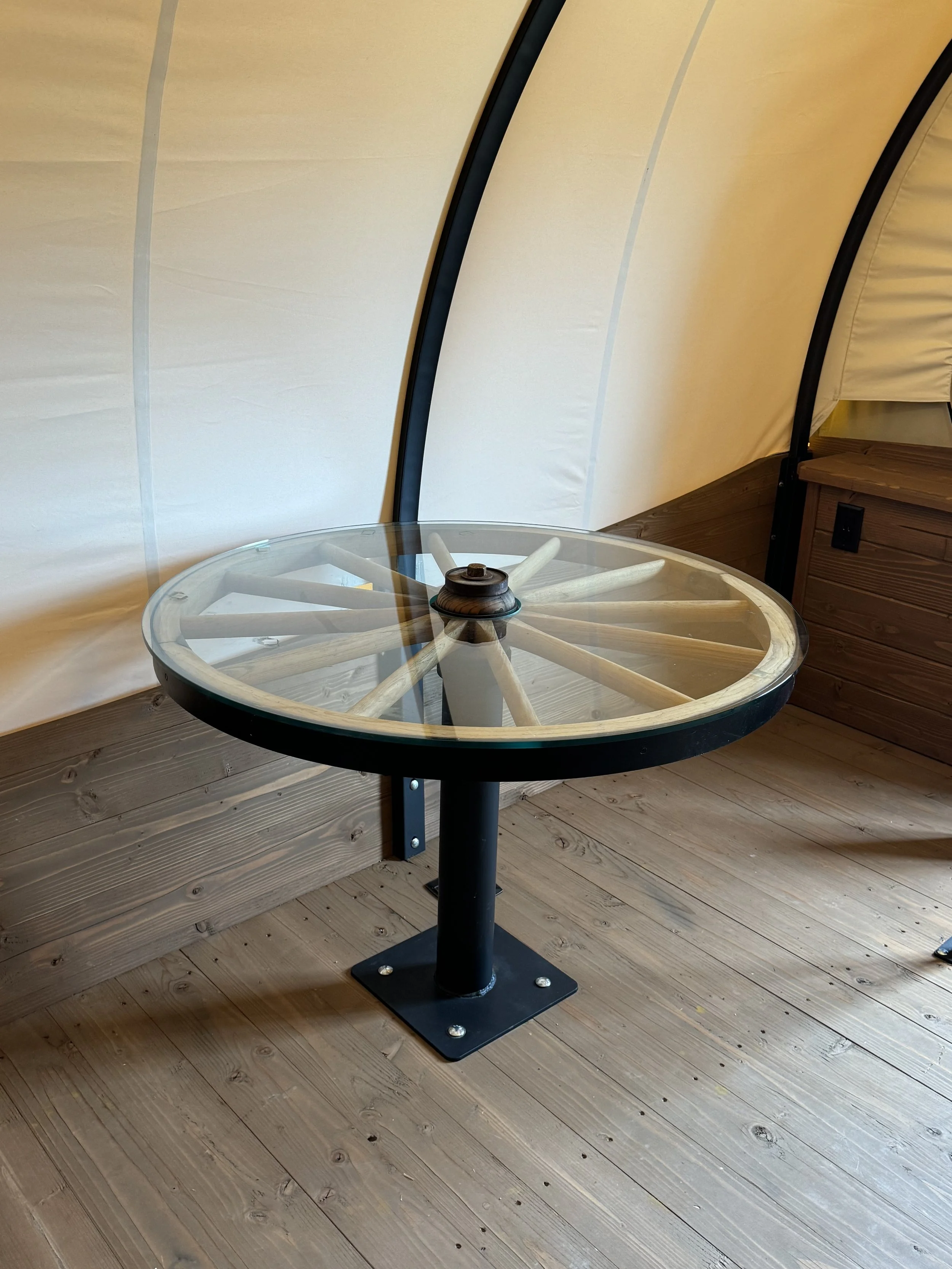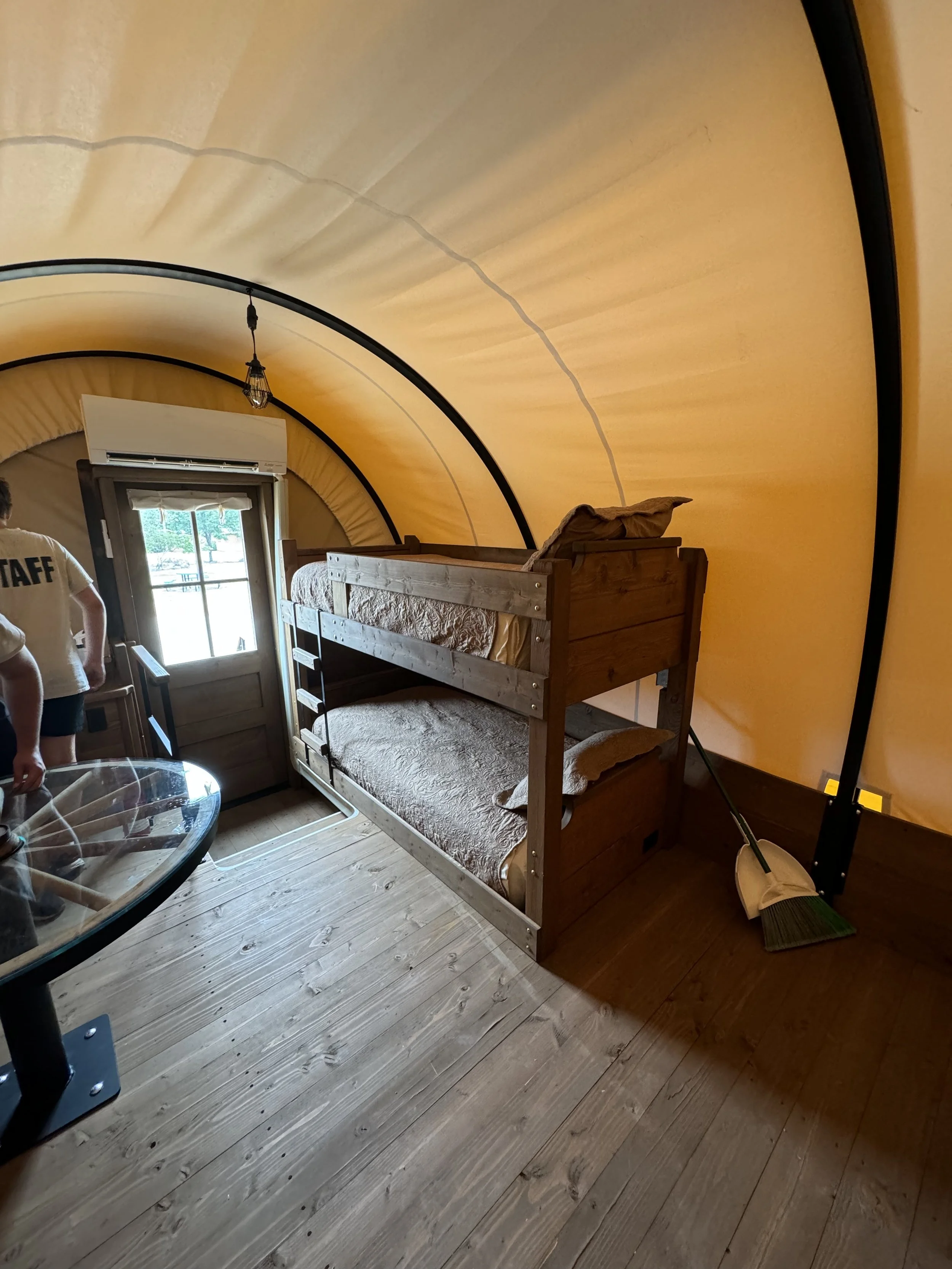 Each wagon contains a king sized bed, a twin bunk bed, and a table. They have heating, air conditioning, electricity, and lights. Each wagon also includes a picnic table and trash can, along with two parking spots. The wagons share a large communal fire pit and have a private bathhouse next to them.